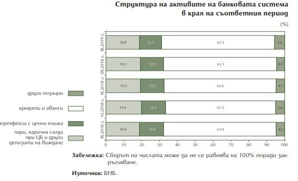 В структурата на активите на банковата система през периода януари – март 2019 г. бяха отчетени следните изменения: понижи се делът на най-ликвидната позиция пари, парични салда при централни банки и други депозити на виждане (от 19,3% на 18,8%); намаля делът на портфейла с ценни книжа (от 12,9% на 12,3%); кредитите и авансите нараснаха в номинално изражение, но запазиха дела си в структурата на активите (63,3%); увеличи се размерът и делът на други позиции, принос за което имаха инвестициите в дъщерни предприятия, съвместни предприятия и асоциирани предприятия и материалните активи.