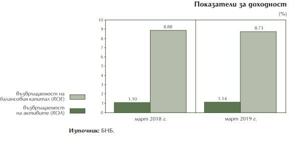 Към 31 март 2019 г. печалбата на банковата система възлезе на 309 млн. лв., с 42 млн. лв. повече спрямо отчетената за първото тримесечие на предходната година. В края на март 2019 г. показателят за възвръщаемост на активите (ROA) бе 1.14%, а възвръщаемостта на балансовия капитал (ROE) – 8.73%.
