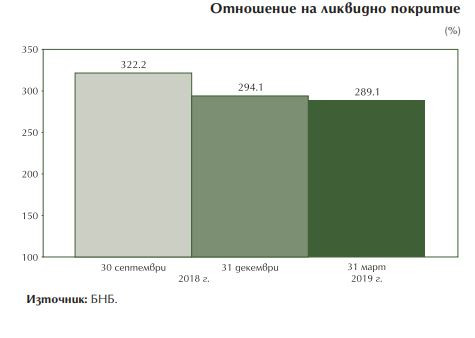 През първото тримесечие на 2019 г. в ликвидната позиция на банковата система нямаше съществени промени и тя остана адекватна на растежа на депозитите и на активите. Съотношението кредити/депозити (LTD) за банковата система се запази почти без промяна – 71,9% в края на март при 72% в края на декември 2018 г.
