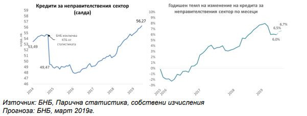Според централната банка, фактор, които ще стимулира растежа на кредита, е предвижданото задържане на лихвените проценти по заемите на достигнатите ниски нива. Факторите, които ще въздействат за ограничаване на кредитния растеж, са свързани с по-ниския очакван темп на растеж на вътрешното търсене, с продължаващо изплащане от страна на правителството на отпуснати кредити по Програмата за енергийна ефективност и намаляване на обема на новите кредити по нея, както и с изчерпването през второто тримесечие на 2019 г. на еднократния ефект от включването на нова отчетна единица в обхвата на паричната статистика.