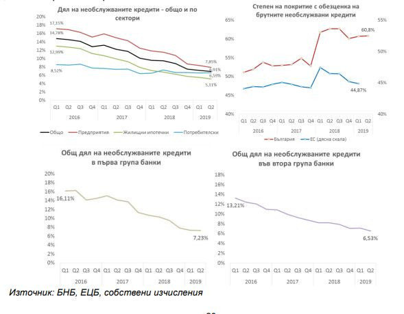 В банковата асоциация отчитат, че в края на второто тримесечие на 2019 г. необслужваните заеми, като дял и като абсолютна стойност, продължават да намаляват. Към 30 юни обемът им (без централни банки и кредитни институции) спада до 4,366 млрд. лв.
