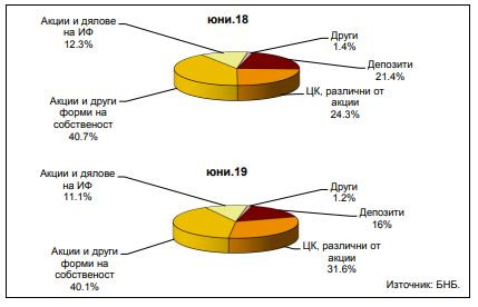 По отношение на инструментите, включени в портфейлите на местните инвестиционни фондове, в края на юни вложенията в акции и други форми на собственост за една година се увеличават с 16% (89,6 млн. лева) до 648,3 млн. лева, депозитите намаляват с 11,6% (34,2 млн. лева) до 259,2 млн. лева, а средствата, вложени в ценни книжа, различни от акции, нарастват с 53,4% (178,2 млн. лева) до 511,9 млн. лева.