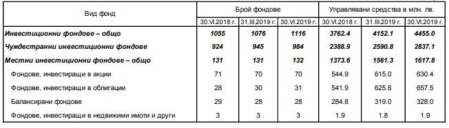Към края на юни активите на местните инвестиционни фондове достигат 1,617 млрд. лева, като на годишна база се увеличават с 17,8% (244,3 млн. лева). В сравнение с март те се увеличават с 3,6% (56,5 млн. лева).