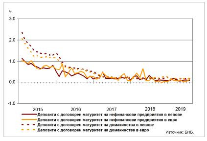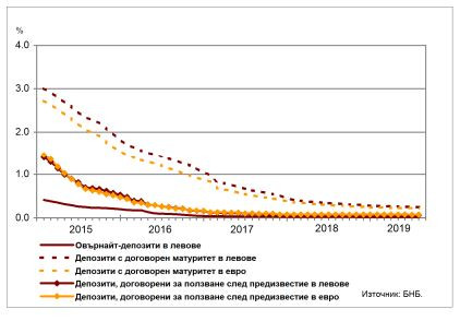 При влоговете с договорен матуритет в левове средният лихвен процент спада с 0,08 пр.п. до 0,25%, а по тези в евро – с 0,07 пр.п. до 0,22%. В сравнение с юли 2018 г. средните лихвени проценти по депозитите, договорени за ползване след предизвестие, в левове и в евро остават почти без промяна съответно на нива от 0,06% и 0,07%.