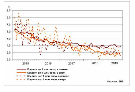 За един месец средният лихвен процент по кредитите до 1 млн. евро, договорени в левове, се увеличава с 0,06 пр.п., а по заемите до 1 млн. евро, договорени в евро, спада с 0,45 пр.п.