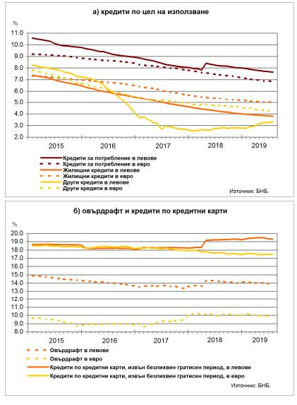 През миналия месец средният лихвен процент по заемите за потребление в левове на годишна база намалява с 0,55 пр.п. до 7,65%, а по кредитите в евро – с 0,59 пр.п. до 6,84%.