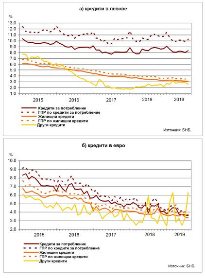 На месечна база ГПР по заемите за потребление в левове расте с 0,42 пр.п., а по тези в евро спада с 0,05 пр.п. При жилищните кредити в левове той остава почти без промяна, а по тези в евро намалява с 0,11 пр.п.