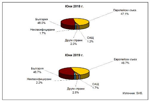 В централната банка пресмятат, че в края на второто тримесечие на тази година средствата, инвестирани в държавите от Европейския съюз, нарастват на годишна база с 6% (214,4 млн. лв.) до 3,797 млрд. лева при 3,583 млрд. лв. преди година, като относителният им дял към края на юни 2019 г. е 46,7% при 47,1% в края на юни миналата година.