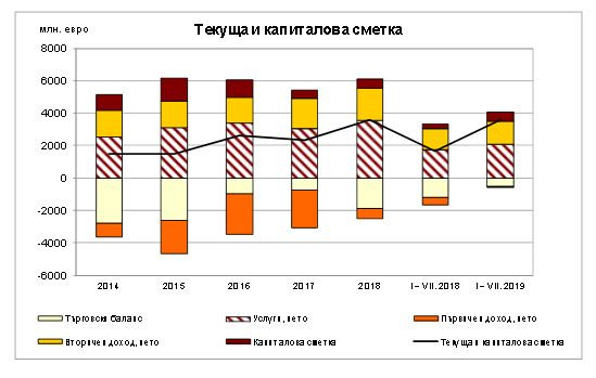 Капиталовата сметка е на плюс със 154,8 млн. евро при положителна стойност от 57,8 млн. евро за юли 2018 г. За периода януари – юли тя излезе на плюс с 589,1 млн. евро, като преди година пак излезе на положителна територия с 252,5 млн. евро.