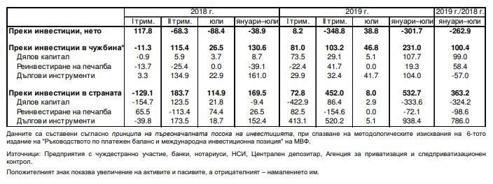 По предварителни данни нетният поток на преките инвестиции в чужбина за януари – юли е за 231 млн. евро, при 130,6 млн. евро за същия период на миналата година. През юли той е положителен и е 46,8 млн. евро, преди година беше 26,5 млн. евро.