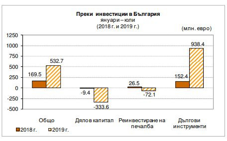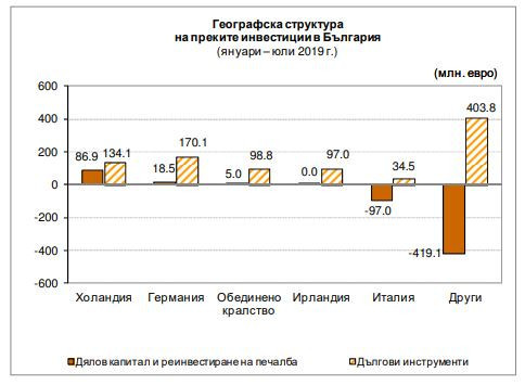 За седемте месеца на тази година нетният поток по подстатия Дългови инструменти (промяната в нетните задължения между дружествата с чуждестранно участие и преките чуждестранни инвеститори по финансови, облигационни и търговски кредити) възлиза на 938,4 млн. евро, при 152,4 млн. евро за периода от януари до юли 2018 г. Най-големите нетни потоци по преки инвестиции в страната за тази година са направени от холандци (221 млн. евро), германци (188,6 млн. евро) и от гражданите на Великобрирания (103,8 млн. евро).