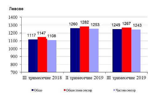 Спрямо същия период на предходната година средната месечна работна заплата през третото тримесечие на 2019 г. в обществения сектор нараства с 10,5%, а в частния - с 12,2%.