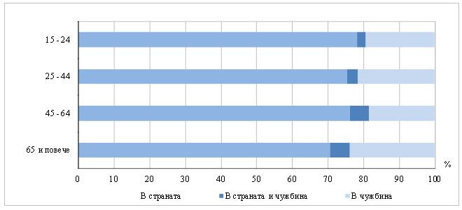 Във всички възрастови групи преобладава относителният дял на пътуванията в страната, като най-висок е при лицата на възраст 15 - 24 години – 78,2% от пътувалите в тази възрастова група.