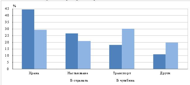 В структурата на разходите по видове, с най-голям относителен дял в страната са тези за храна – 44,5%, докато в чужбина са разходите за транспорт – 30,1%.