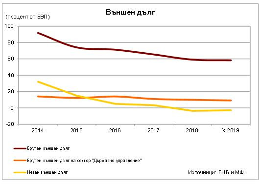 Брутният външен дълг на сектор Държавно управление в края на октомври е 5,400 млрд. евро и за една година се понижава с 200,3 млн. евро (3,6%). Спрямо края на 2018 г. той намалява със 140,3 млн. евро (2,5%).