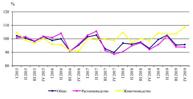 В НСИ отчитат, че индексът на цените на продуктите и услугите за текущо потребление в селското стопанство за четвъртото тримесечие на 2019 г. е по-висок с 1,4% спрямо същото тримесечие на 2019 година и с 2,1% спрямо 2018 година.