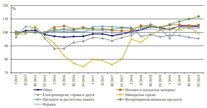 За периода октомври – декември спрямо същото тримесечие на 2018 г. по-високи са цените на ветеринарномедицинските продукти - със 7,3%, фуражите - с 2,6%, посевния и посадъчния материал - с 2,1%, електроенергията и горивата - с 1,2%. По-ниски са цените на минералните торове - с 2,4%, и на продуктите за растителна защита - с 0,7%.