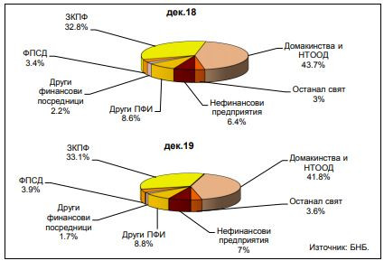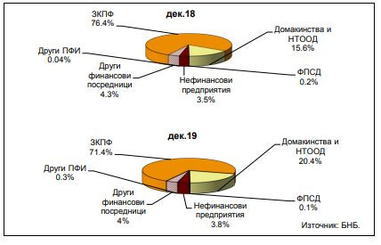 По институционални сектори задълженията на местните инвестиционни фондове към резиденти в сектор Застрахователни компании и пенсионни фондове за една година се увеличават със 74,4 млн. лева (15,2%) и в към 31 декември 2019 година са 565,2 млн. лева, а към домакинствата ръстът е с 59,2 млн. лева (9,1%) до 713,1 млн. лева.