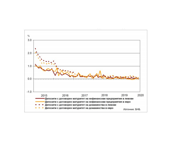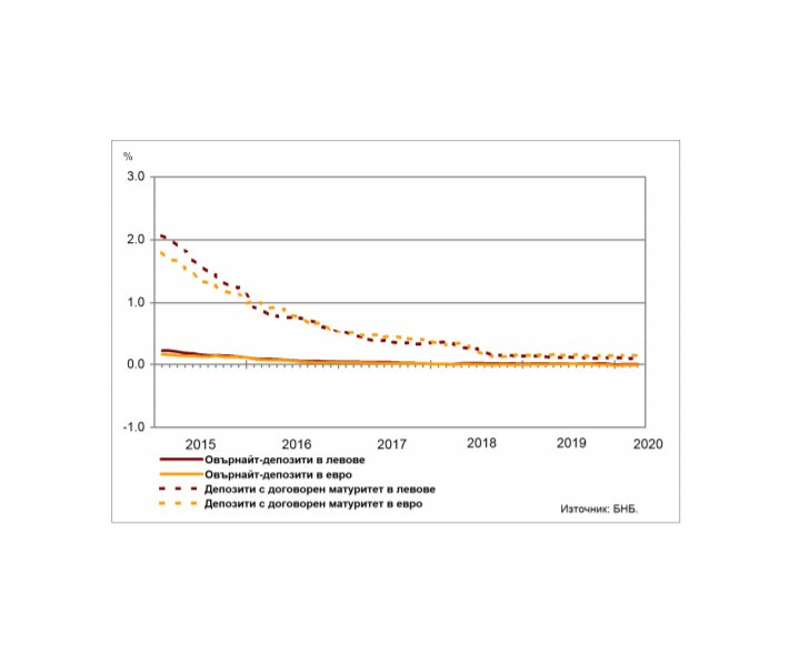 В централната банка отчитат, че средният лихвен процент по депозитите на фирмите с договорен матуритет в левове през март спада на годишна база с 0,04 процентни пункта до 0,02%, а по тези в евро – с 0,08 пр.п. до -0,03%. В сравнение с февруари 2020 г. средният лихвен процент по влоговете с договорен матуритет в левове намалява с 0,01 пр.п., а по тези в евро - с 0,07 пр.п.