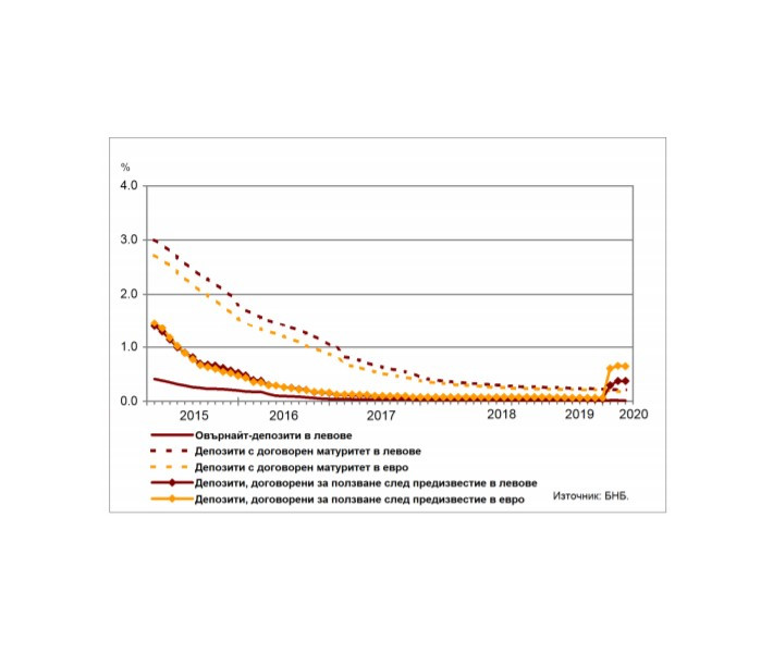 При влоговете с договорен матуритет в левове и в евро средният лихвен процент спада с 0,05 пр.п. съответно до 0,21% и 0,18%. В сравнение с март 2019 г. средната лихва по депозитите, договорени за ползване след предизвестие, в левове се повишава с 0,31 пр.п. до 0,38%, а по тези в евро – с 0,57 пр.п. до 0,65%.