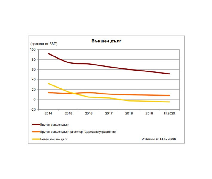 Брутният външен дълг на България (частен и държавен) намалява като част от брутния вътрешен продукт (БВП). Към края на март 2020 г. дългът възлиза на 33,495 млрд. евро, което е годишен спад с 2,2% (738,3 млн. евро).Така той представлява 51,5% от прогнозния БВП на страната, показват предварителните данни на Българската народна банка (БНБ).
