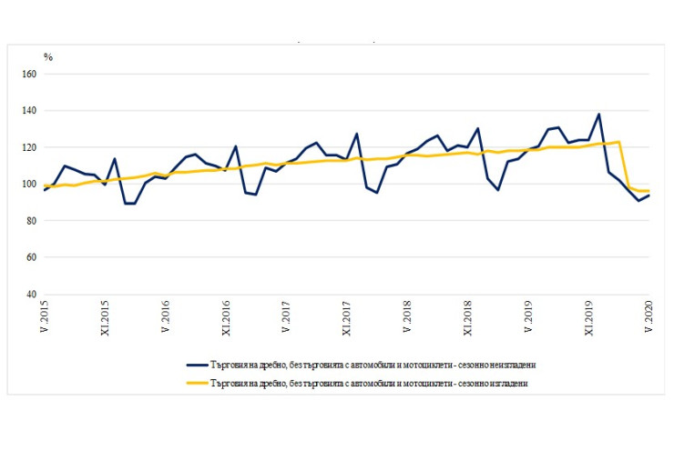 Оборотът в раздел „Търговия на дребно, без търговията с автомобили и мотоциклети“, изчислен въз основа на календарно изгладени данни, намалява с 20,4% на годишна база, след годишен спад с 19,9% в сравнение с април. Това е и най-големият спад в търговията на дребно, откакто започва да се правят тези измервания през януари 2001 г., показват данните на Националния статистически институт.