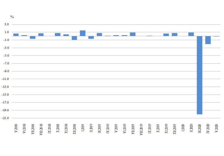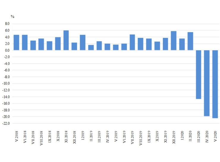 През май 2020 г. в сравнение с година по-рано се наблюдава спад на оборота при: търговията на дребно с автомобилни горива и смазочни материали (с 33,9%), търговията на дребно с нехранителни стоки, без търговията с автомобилни горива и смазочни материали, (с 18%) и търговията на дребно с хранителни стоки, напитки и тютюневи изделия (със 17,4%).