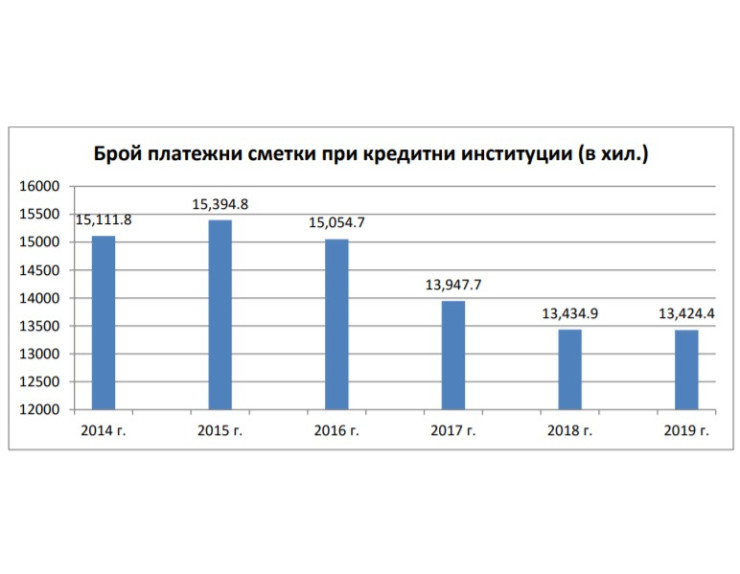 През 2019 г. броят на платежните сметки в кредитните институции у нас е достигнал 13,424 милиона. За сравнение, четири години по-рано техният брой е бил най-голям в платежната система на България - над 15,394 милиона.