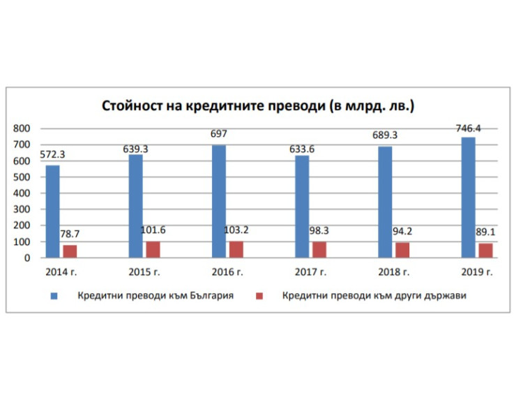 Стойността на кредитните преводи към нашата страна през 2019 г. е 746,4 млрд. лева, а към други държави – 89,1 млрд. лева.