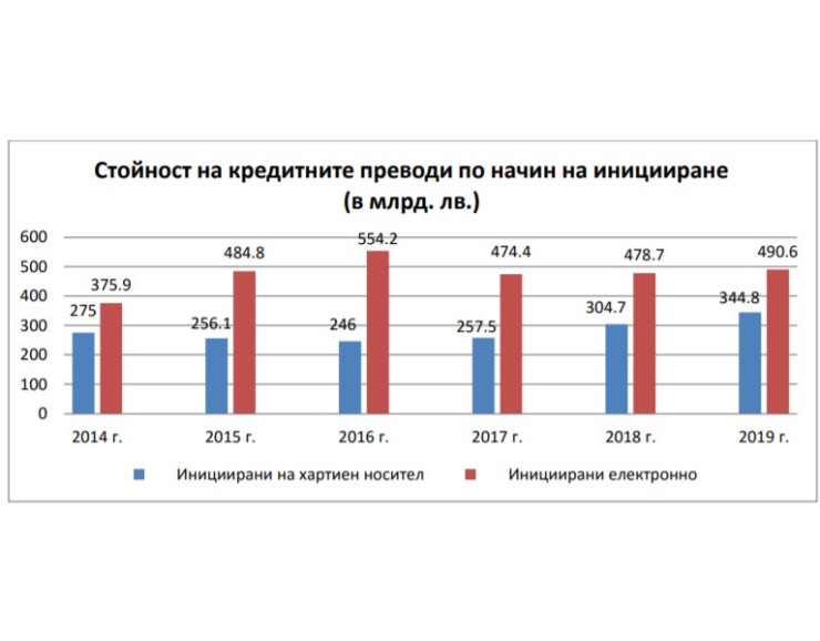 Обемът на кредитните преводи, когато са инициирани на хартиен носител, през миналата година е на стойност 344,8 млрд. лева, а когато трансакциите са електронни - 490,6 млрд. лева.