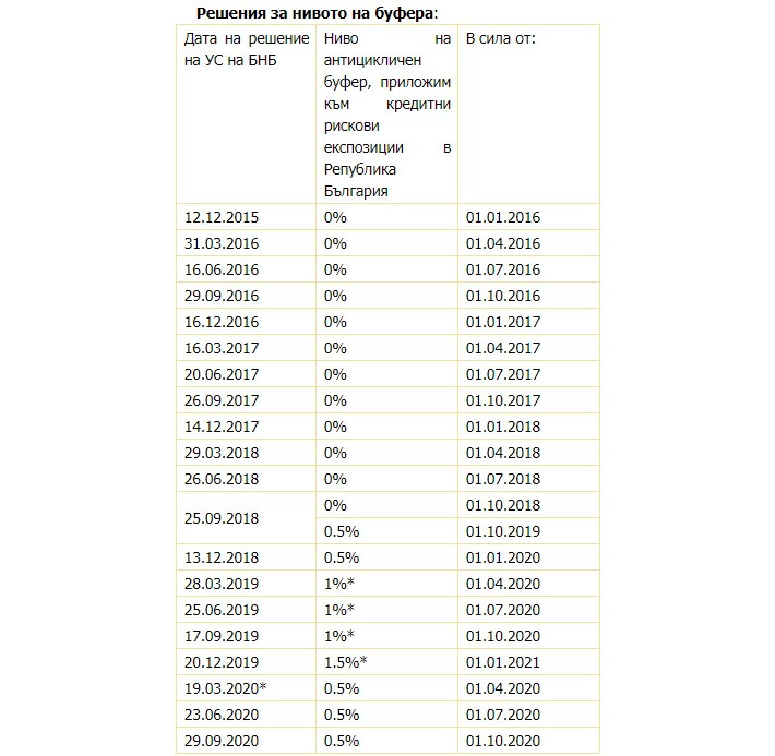 Във връзка с пандемията от COVID-19, през март 2020 г. Управителният съвет на БНБ прие пакет от мерки, включващ отмяна на предвидените за 2020 г. и за първото тримесечие на 2021 г. увеличения на нивото на антицикличния капиталов буфер, приложим към местните кредитни рискови експозиции, и запазване на равнището от 0,5%, което бе непроменено и през третото тримесечие на 2020 г.