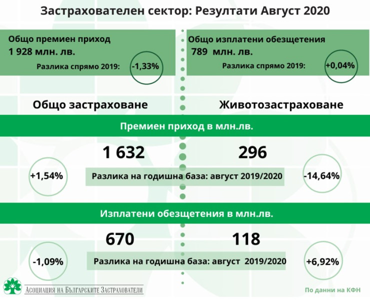 През август премийният приход достига 296 млн. лева, като намалението на годишна база е 14,64%. Размерът на изплатените обезщетения към 31 август от 118 млн. лева е с 6,92% по-висок от същия период на миналата година.