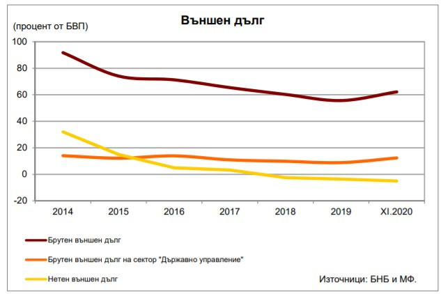 Нетният външен дълг в края на ноември е 3,011 млрд. евро, като намалява с 1,888 млрд.евро (168,1%) спрямо края на 2019 г. (отрицателна стойност от 1,123 млрд. евро, 1,8% от БВП).