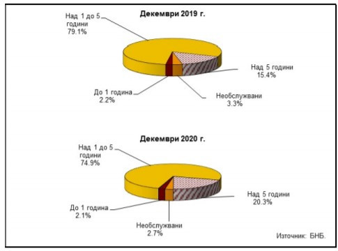 Кредитите с матуритет над една година представляват 89,5% от общия размер на получените кредити в края на декември 2020 г. при 84,7% в края на същия месец на 2019 г. Техният размер е 3,732 млрд. лв. в края на декември, като на годишна база те нарастват със 7,3% (253,3 млн. лв.) и с 1,5% (56,3 млн. лв.) спрямо края на третото тримесечие на миналата година.