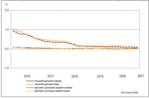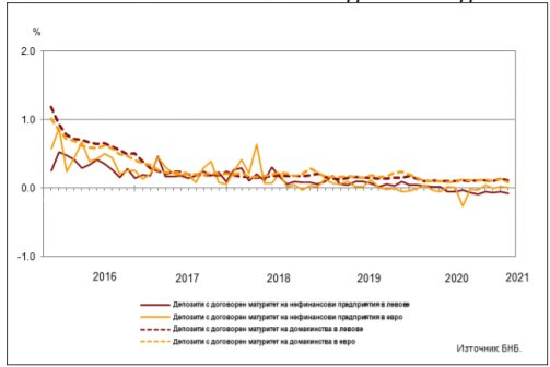 В централната банка изчисляват, че средният лихвен процент по депозитите на фирмите с договорен матуритет в левове на годишна база намалява с 0,11 пр.п. до -0,07%, а по тези в евро се повишава с 0,01 пр.п. до 0,01%.