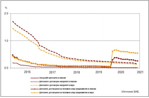 При спестяванията с договорен матуритет в левове и в евро средните лихвени проценти намаляват с 0,06 пр.п. съответно до 0,16% и 0,13%. В сравнение с януари 2020 г. средната лихва по депозитите, договорени за ползване след предизвестие, в левове се понижава с 0,04 пр.п. до 0,26%, а по тези в евро – с 0,06 пр.п. до 0,55%.