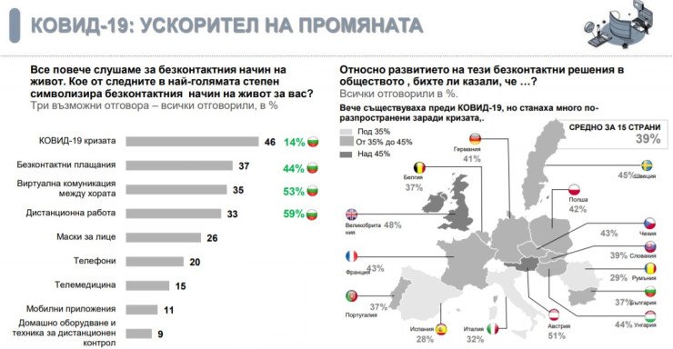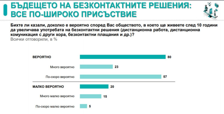 Проучването показва, че според 53% от участниците е желателно в следващите десет години да използваме повече безконтактни решения, а 80% заявяват, че независимо дали ни харесва или не, тези практики ще бъдат все по-широко застъпени в живота. Това е знак, че много хора напускат зоната си на комфорт и свикват да живеят в безконтактен свят, като се адаптират и осъзнават, че в бъдеще тези решения, особено при работа и пазаруване, ще са част от живота ни.