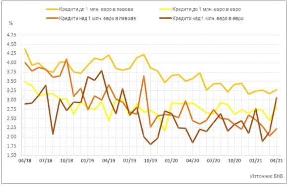 През миналия месец средният лихвен процент по кредитите на фирмите до 1 млн. евро, договорени в левове, се увеличава с 0,11 пр. п. до 3,28%, а по тези над 1 млн. евро – с 0,20 пр. п. до 2,23% през април.