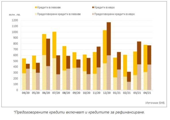 Заемите, които фирмите договориха през април с банките, отбелязват ръст в обемите, но докато кредитите за бизнеса в левове, както и предоговорените заеми растат на месечна и годишна база, при някои от заемите в евро има спад. Обемът на потребителските и жилищните заеми на домакинствата растат в сравнение с април 2020 г. и март 2021 година, но лихвите намаляват, става ясно от предварителните данни на Българската народна банка (БНБ).