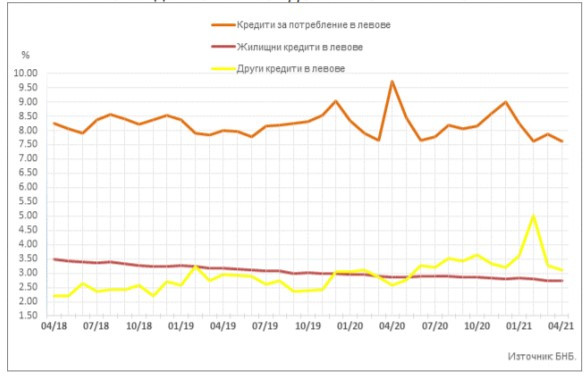 През април 2021 г. средният лихвен процент по овърдрафта в левове се увеличава с 0,09 пр. п. до 15,02%, а при кредитите по кредитни карти в левове – с 0,05 пр. п. до 20,32%.
