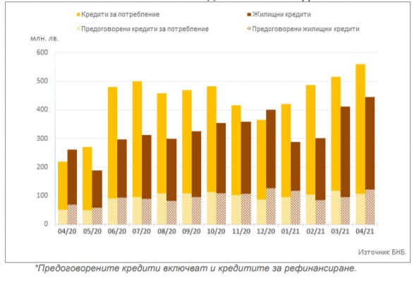 Увеличение се наблюдава и при обема на предоговорените кредити и кредитите за рефинансиране, договорени в левове, с 20,8% (53,8 млн. лв.) до 312,4 млн. лв.