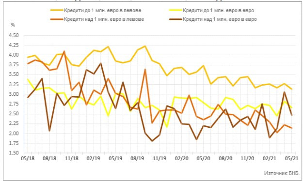Средният лихвен процент по кредитите до 1 млн. евро, договорени в левове, за фирмите се понижава през май в сравнение с април с 0,15 процентни пункта до 3,13%, а по тези над 1 млн. евро – с 0,09 пр. п. до 2,14%.