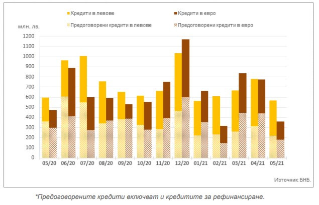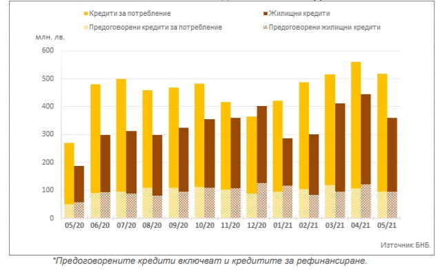 Обемът по нов бизнес по заемите за потребление в левове намалява в сравнение с април със 7,8% (44 млн. лв.) до 517,2 млн. лв., като при предоговорените кредити и кредитите за рефинансиране той се понижава с 11% (11,9 млн. лв.) до 96,1 млн. лв.
