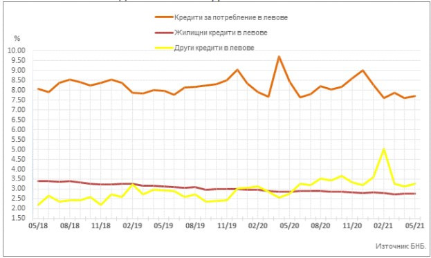 Средният лихвен процент по кредитите за потребление в левове за домакинствата през май нараства с 0,07 пр. п. в сравнение с април до 7,69%, а годишният процент на разходите (ГПР) по тези кредити – с 0,11 пр. п. до 8,18%.