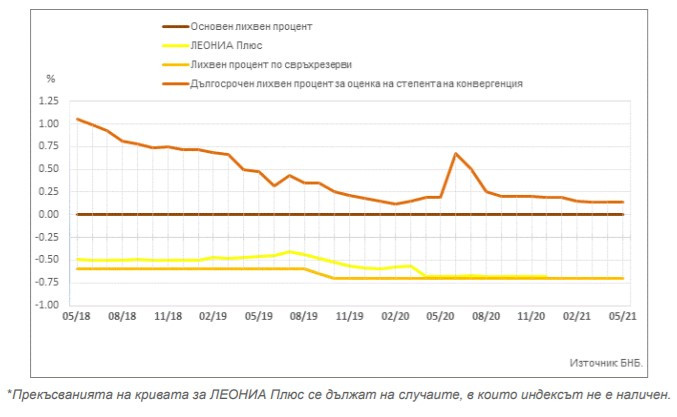 Индексът ЛЕОНИА Плюс през април и май 2021 г. не е наличен. Лихвеният процент по свръхрезервите остава непроменен на ниво от -0,70%.