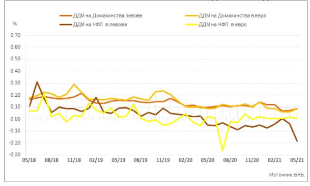 В централната банка отчитат, че през май средният лихвен процент по овърнайт-депозитите в левове намалява с 0,01 пр. п. до 0,00%, а по тези в евро се запазва на ниво от 0,00%.