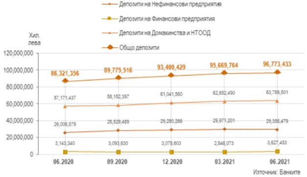 Спестяванията на фирмите в края на юни са 601 хил. броя, като се отчита ръст от 3,2% спрямо края на същия месец на 2020 г. В края на второто тримесечие размерът на тези депозити е 29,356 млрд. лева, като на годишна база той нараства с 12,9%. Спрямо края на март броят им се повишава с 2,5%, а размерът им – с 13,7%.