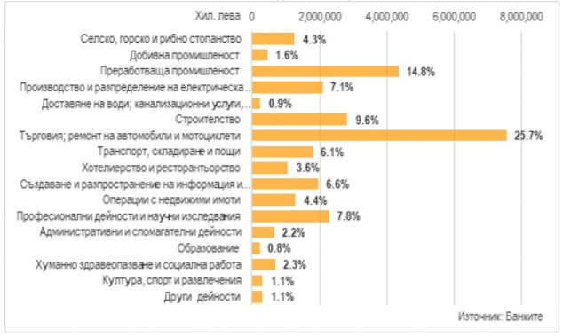 Трите отрасъла с най-големи дялове в общата сума на кредитите за сектора са "Търговия; ремонт на автомобили и мотоциклети" (26,5%), "Преработваща промишленост" (21%) и "Операции с недвижими имоти" (10,7%).