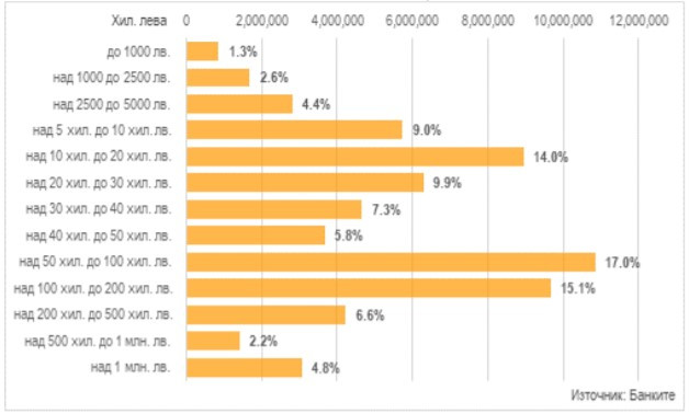 Към 30 юни в общата сума на депозитите преобладават тези с размер над 50 хил. до 100 хил. лева с дял от 17%.
