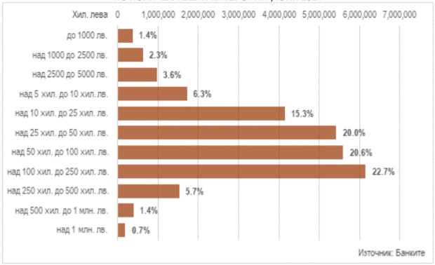 Към края на второто тримесечие в общата сума на заемите преобладават тези с размер над 100 хил. до 250 хил. лева с дял от 22,7%.